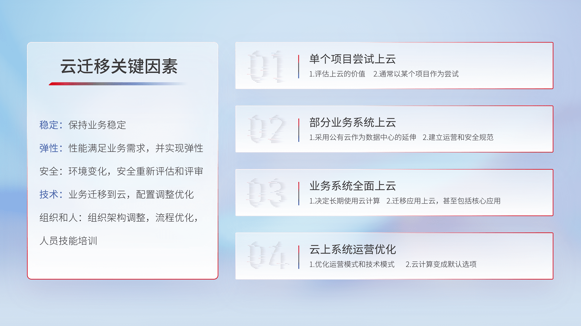 结合实际业务,,从规划设计、、、、云平台选型、、云原生改造、、数据迁移、、集成交付,,迁移全过程为客户识别最佳上云路径,,,做好风险识别管理,,,设计网络架构、、身份权限、、、安全审计合规、、、操作审计、、、日志审计、、、监控告警策略、、、多站点容灾设计等,,,对云上基础设施进行整体规划,,,,提升IT治理水平,,,以满足弹性、、、高可用、、、、高性能的需求。。